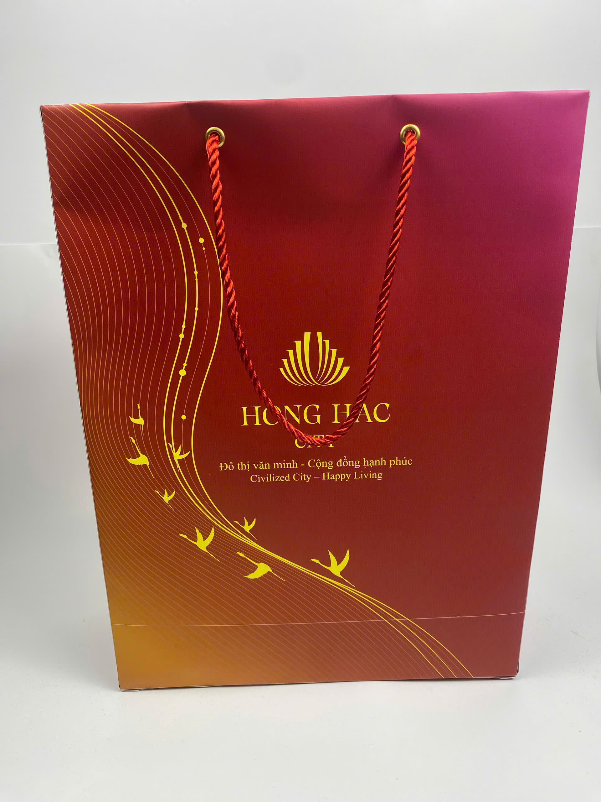 Mẫu túi giấy thương hiệu HỒNG HẠC trong hình mang phong cách sang trọng với tông màu đỏ – vàng nổi bật. Thiết kế logo đặt ở trung tâm giúp thương hiệu dễ dàng thu hút ánh nhìn và tạo dấu ấn riêng khi khách hàng cầm trên tay.